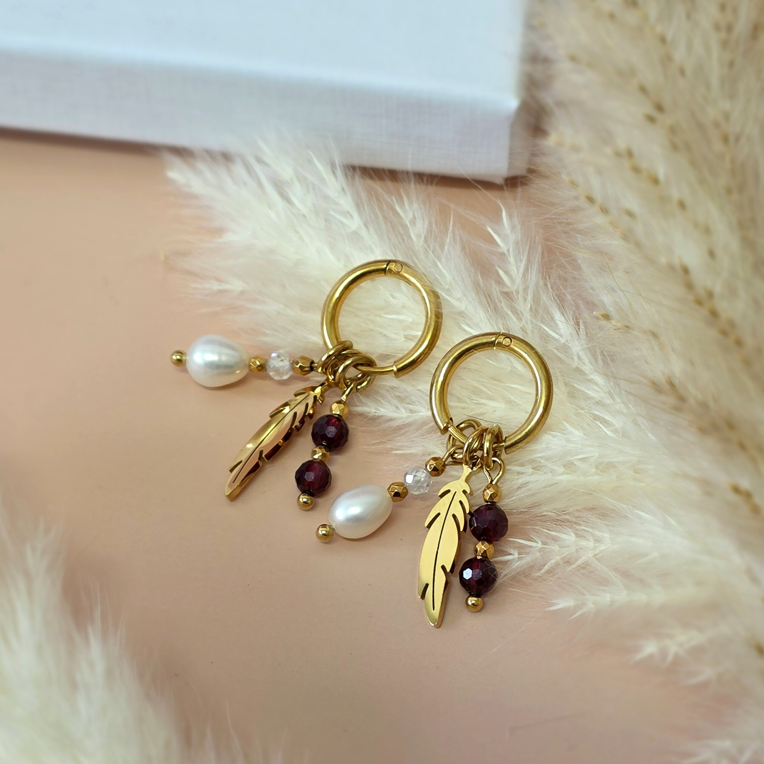 Kamienie użyte do wykonania kolczyków: PERŁA ok 3/4mm – symbol czystości i niewinności, GRANAT ok 4mm – kamień miłości oraz pasji, CYRKONIA ok 4mm – znana z blasku i wytrzymałości, HEMATYT ok 2mm – kamień ochronny, który pomaga w koncentracji i stabilizacji emocjonalnej.