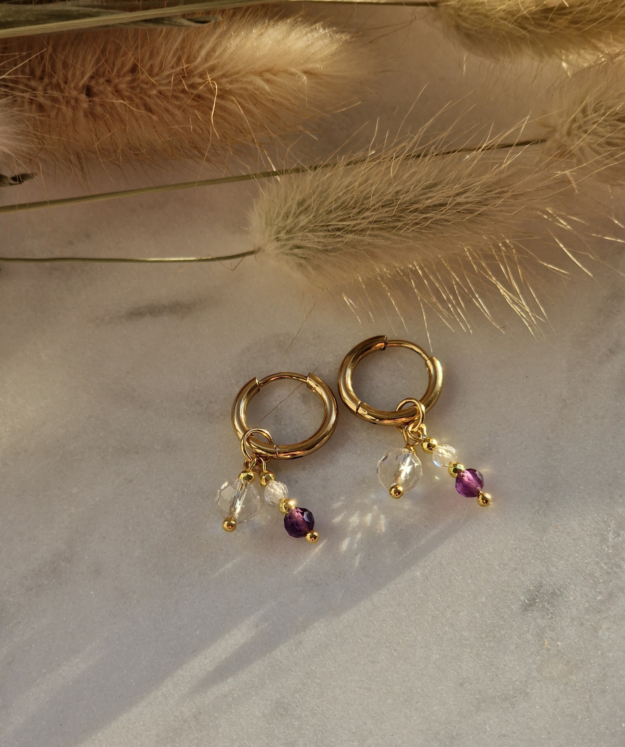 Kamienie użyte do wykonania kolczyków : KRYSZTAŁ GÓRSKI ok 6mm, AMETYST ok 4mm, CYRKONIA ok 3mm, HEMATYT ok 2mm.
