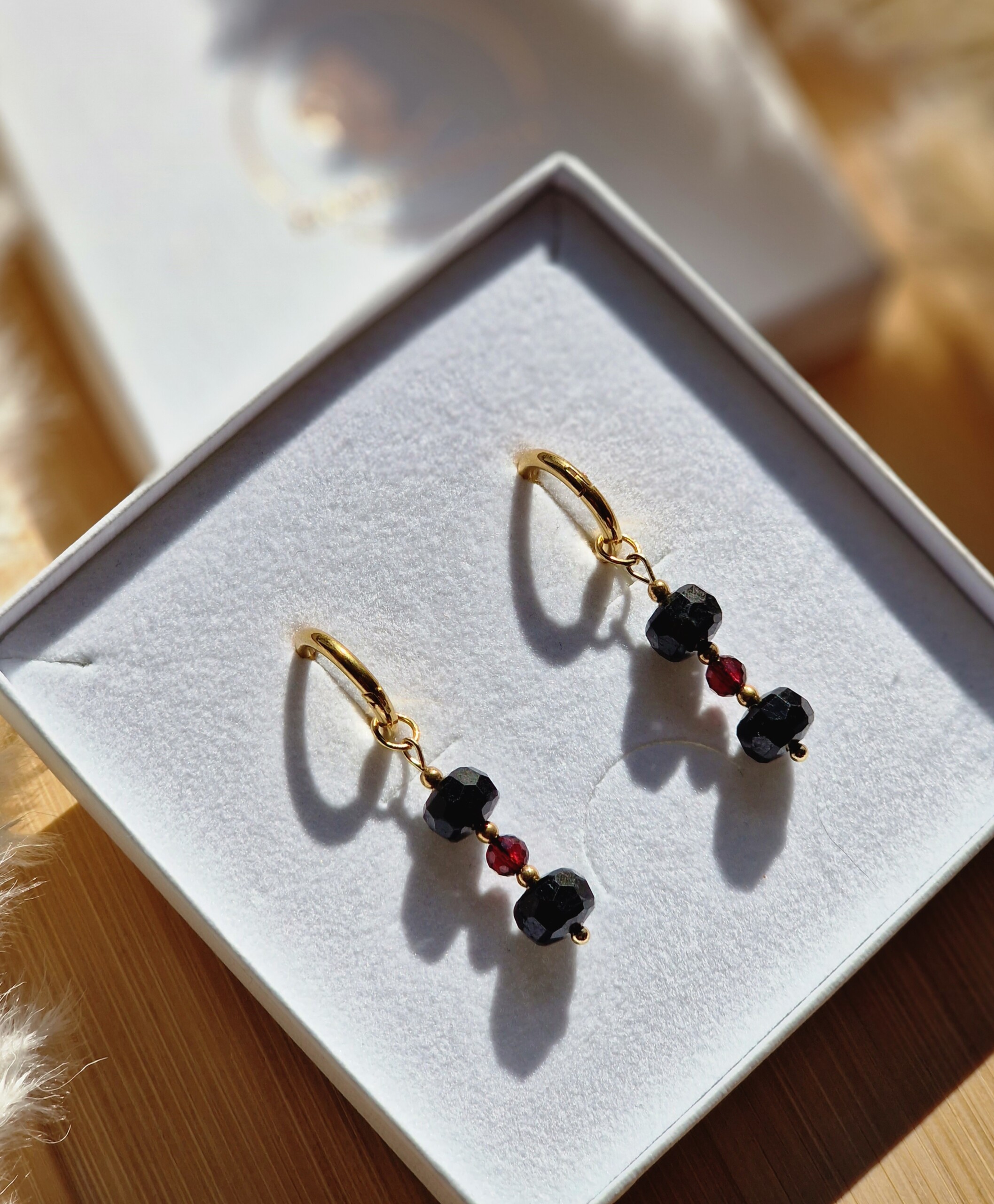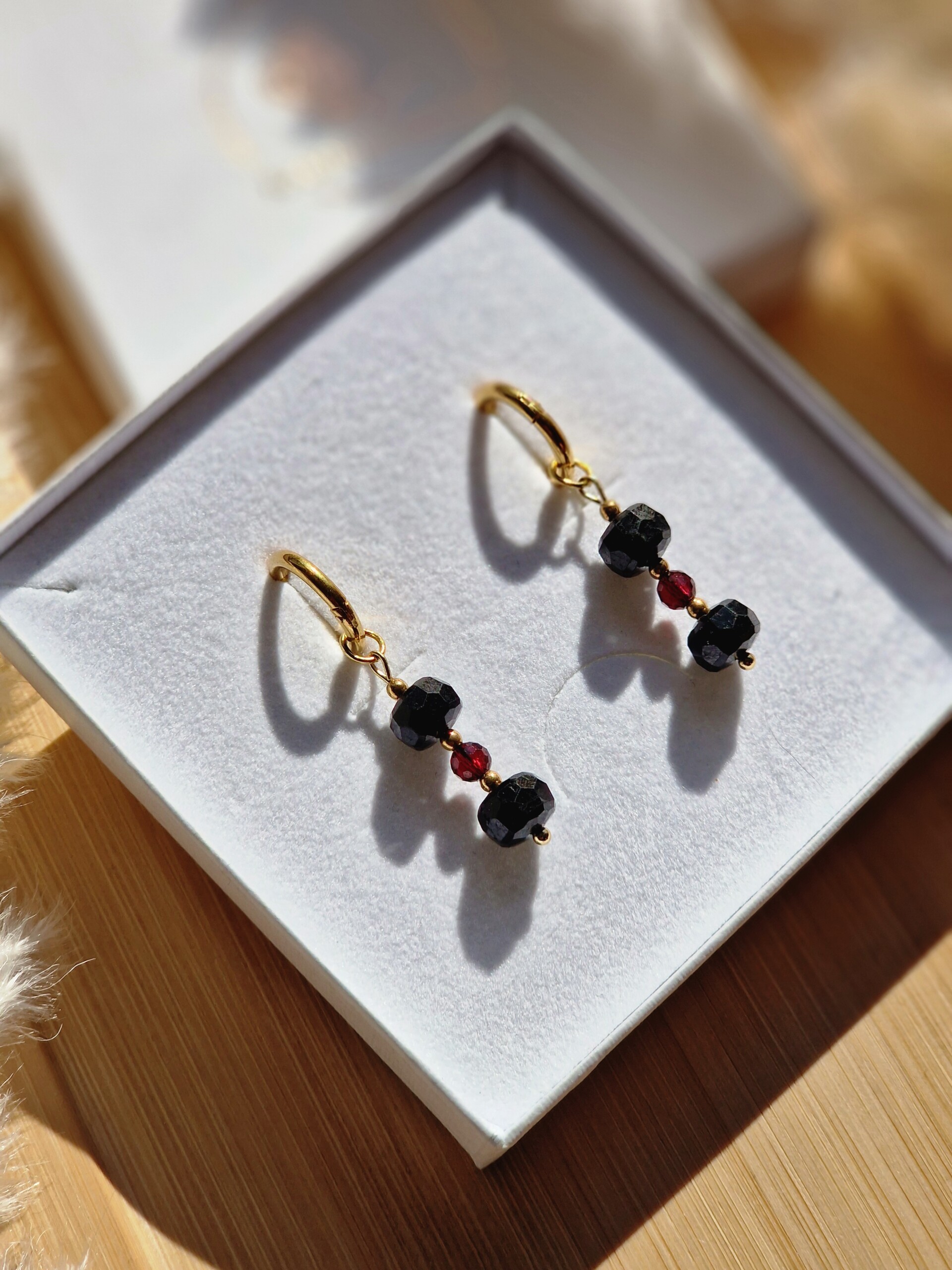 Kamienie użyte do wykonania kolczyków : TURMALIN ok 6/8 mm, GRANAT ok 4mm, HEMATYT ok 2mm.