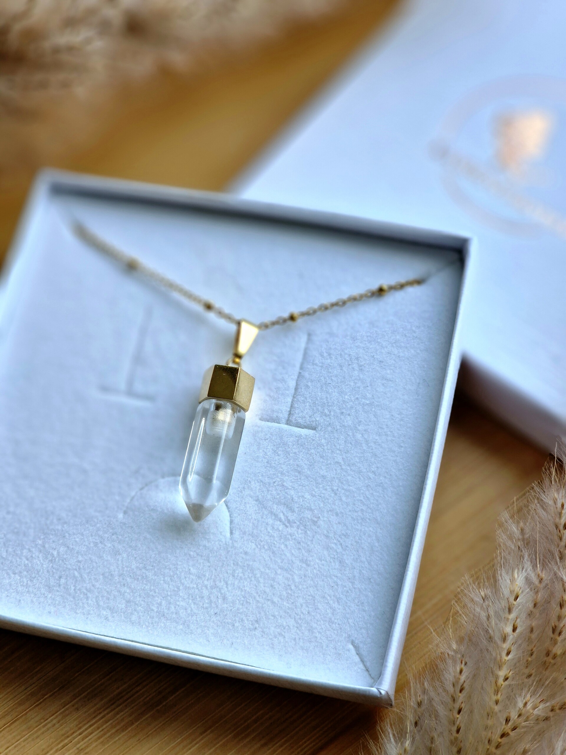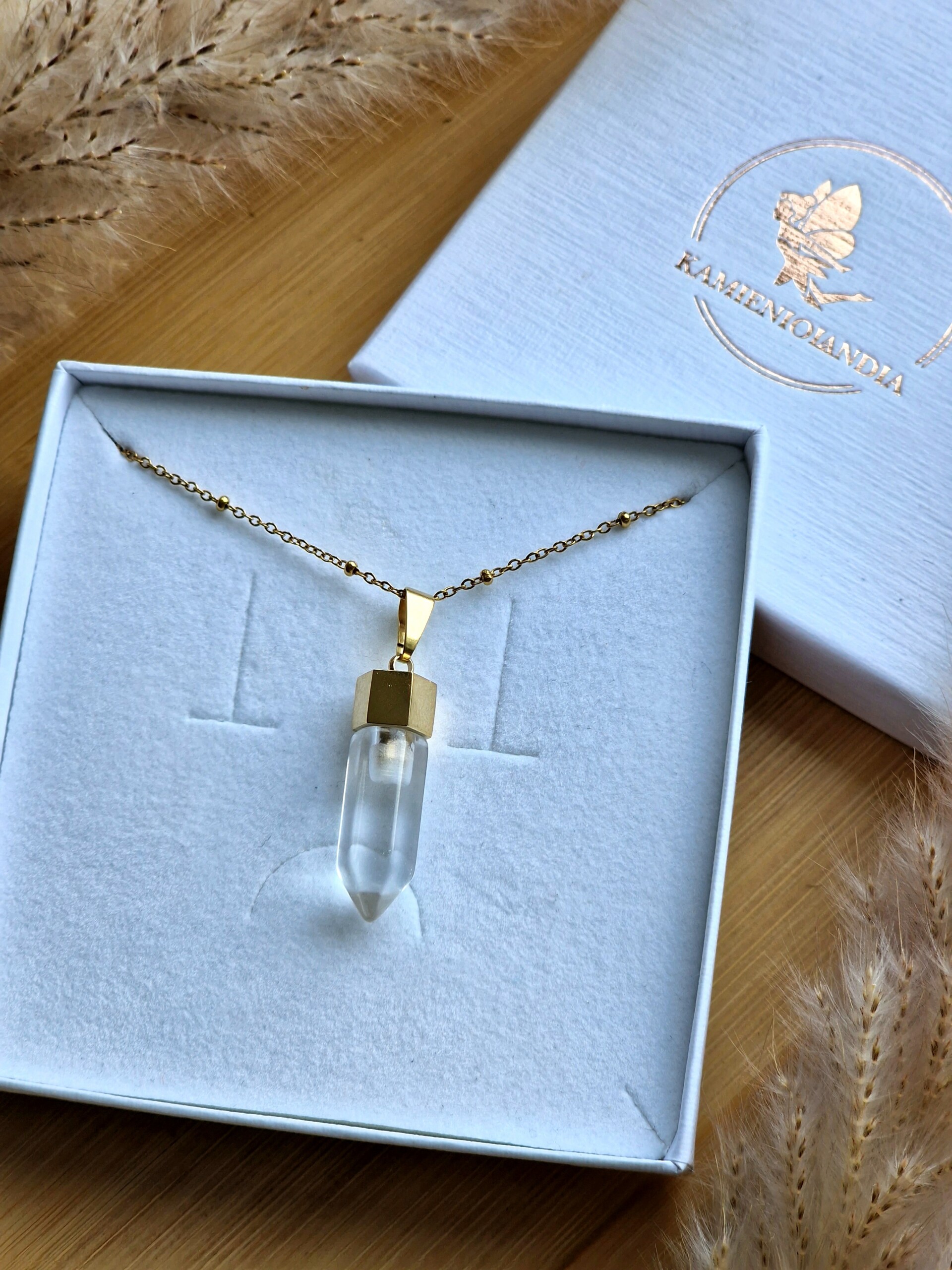 Kamień użyty do wykonania naszyjnika : KRYSZTAŁ GÓRSKI (razem z okuciem ze stali szlachetnej) ok 30/9 mm