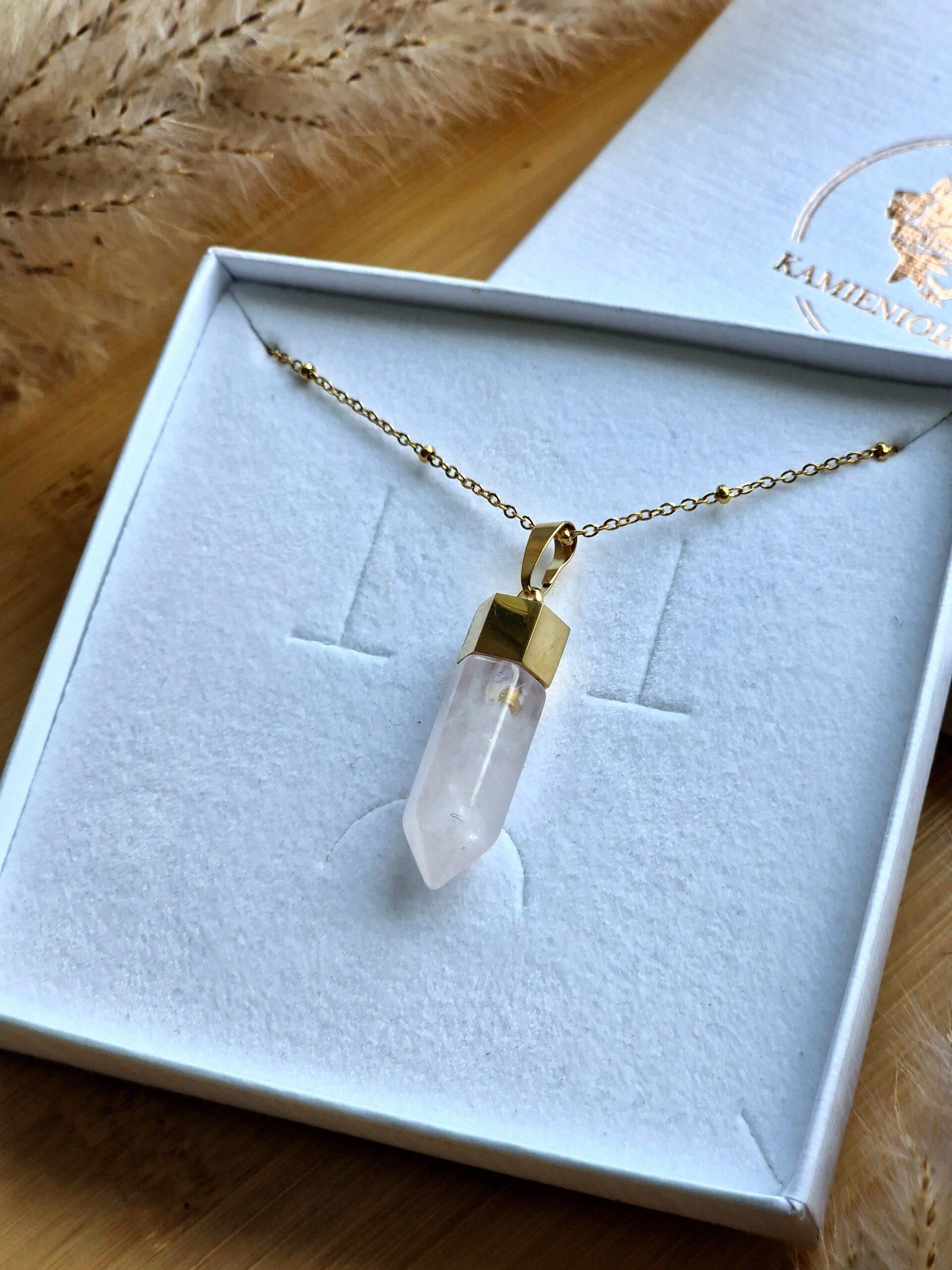 Kamień użyty do wykonania naszyjnika :  KWARC RÓŻOWY (razem z okuciem ze stali szlachetnej)   ok 30/9 mm