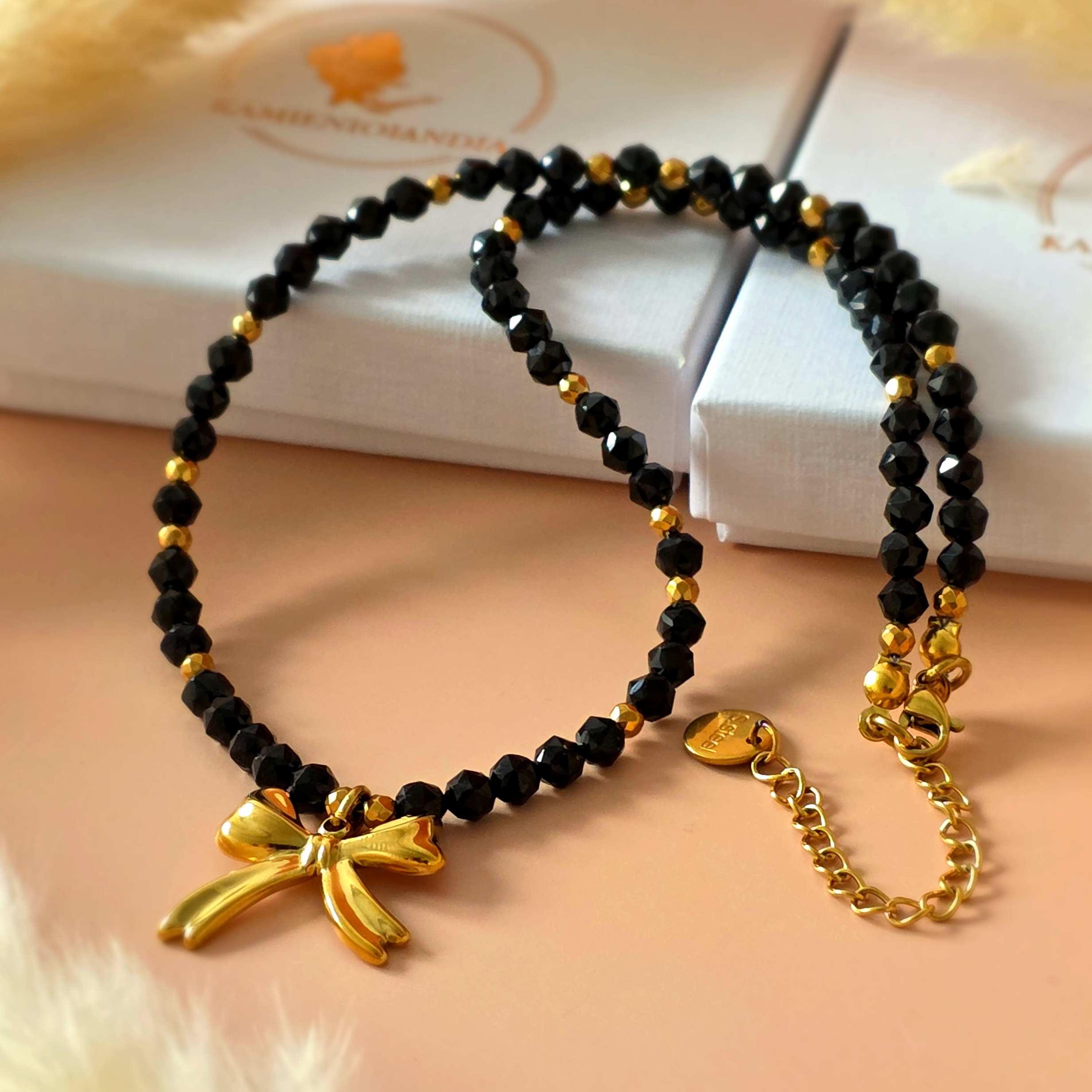 Zapięcie oraz kokardka wykonane ze stali chirurgicznej.
